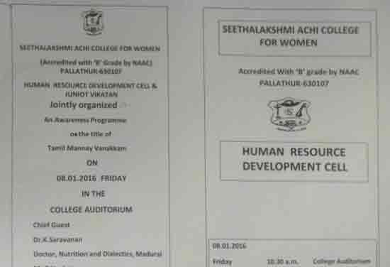 Under the auspices of the HRD Cell of our College organized a programme on 22.01.2015. Dr. S. Thiagarajan, H.O.D. of Economics, Sourashtra College, Madurai, inaugurated the activities of the HRD Cell. On the same day the Chief Guest Dr. S. Thiagarajan conducted a One-Day Workshop for students on the topic “Performance Management for Effective Entrepreneurship” between 10.30 am. and 1.00 pm. He gave many useful tips as how to develop leadership qualities, to set goal, talked about courage, self-confidence and time management through powerpoint presentation with interesting anecdotes. The Chief Guest Dr. S. Thiagarajan inspired the students with the most significant topics like ‘Personal Development’, ‘improving Self-Awareness’, ‘Developing Talents’, ‘Health’ etc. He gave training on how to be different and how to act and think differently. He also conducted job-oriented Work-shop like ”Group- discussion” , Building the Resume, and on ‘Etiquete’. The impact on the students was more as they were able to visualize the workshop on a large screen.